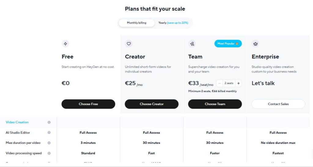 HeyGen operates on a simple subscription model. For $30 per month, you can generate unlimited videos. This predictability and scalability make it the clear winner for serious content creators looking to automate their output.